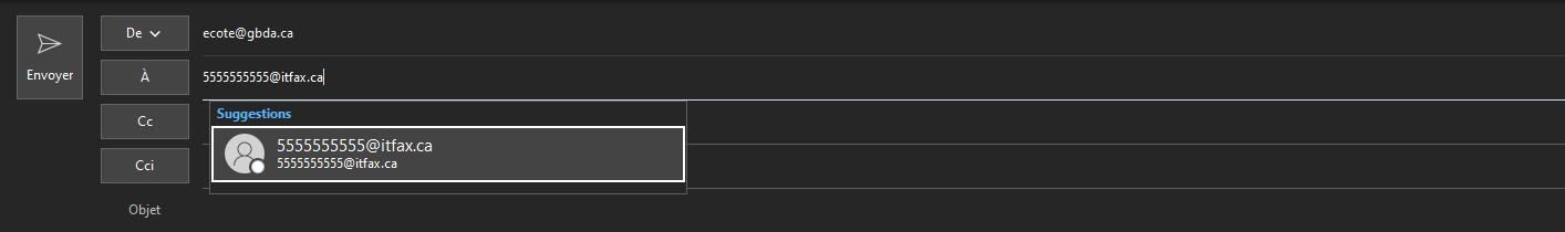3- Dans le champ destinataire ( to ), mettez le numéro du fax ( sans trait d'union ou autre caractère ) toujours suivi de @itfax.ca