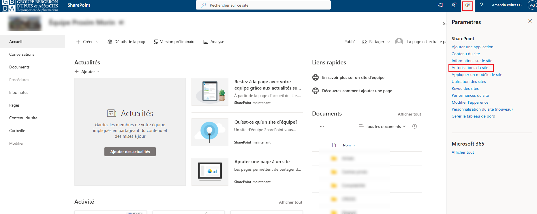 -Dans la page d'accueil de votre sharepoint, rendez-vous dans les paramètres, puis dans "Autorisations du site":