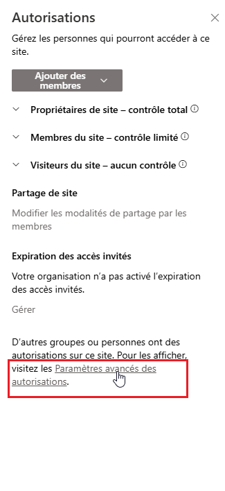 -Ça vous ouvrira cette fenêtre à droite de l'écran. Cliquez sur "Paramètres avancés des autorisation".