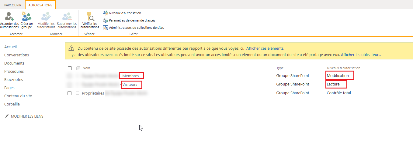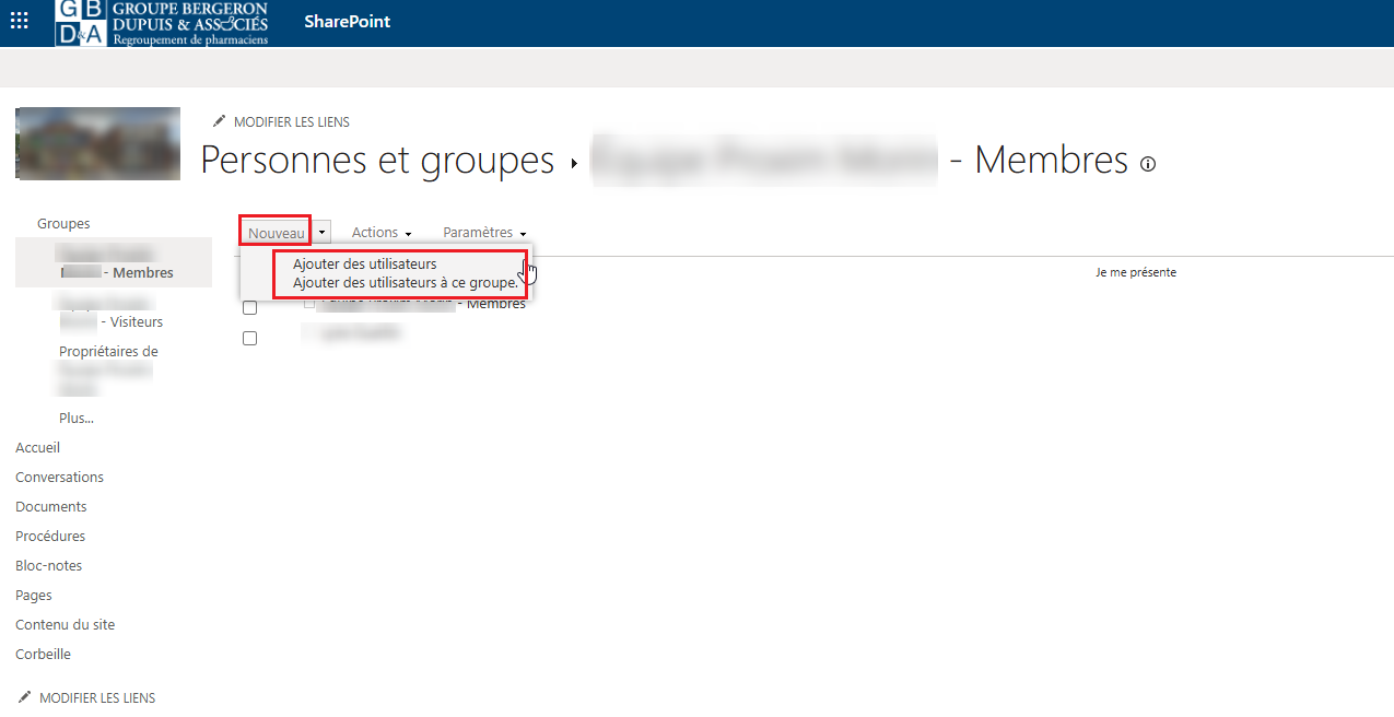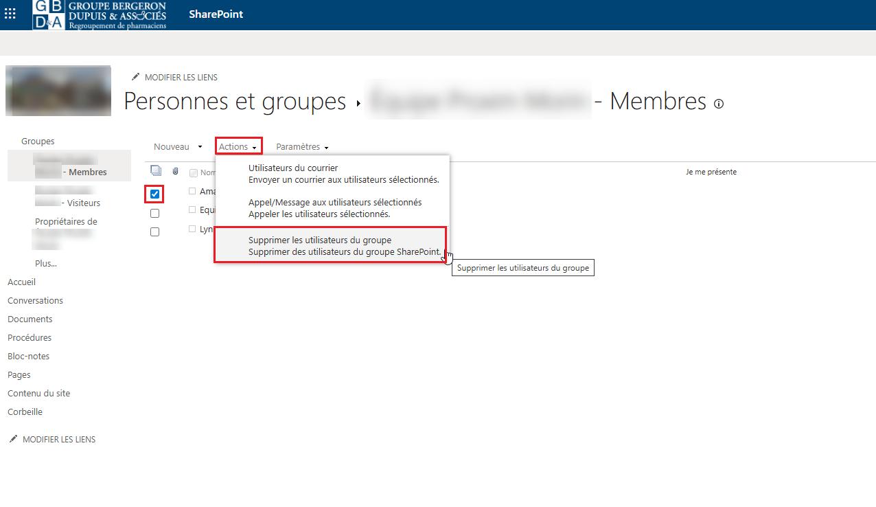 -Si vous voulez supprimer un usager du sharepoint, rendez-vous dans la même section, mais au lieu d'ajouter un usager, cochez l'usager que vous souhaitez retirer, cliquez sur "Actions" et choisissez l'option de "Supprimer les utilisateurs du groupe". Vous aurez une confirmation de suppression.
