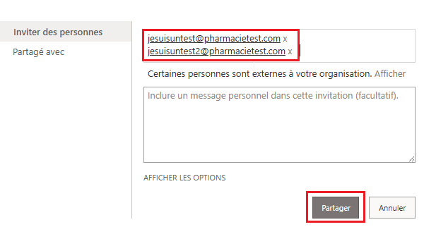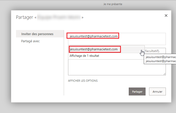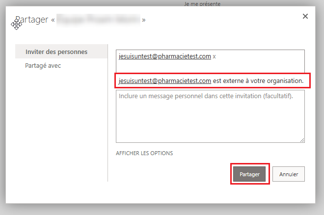 -Vous verrez qu'elle sera détectée comme adresse courriel externe. Cliquez sur "Partager"